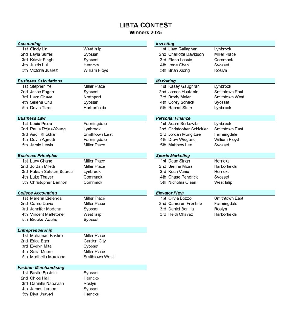 The LIBTA Contest is hosted annually by the LIBTA. Schools from all over the region compete in a variety of business topics. The LIBTA Contest is a way for students to build upon their business knowledge and a meaningful addition to their resume accomplishments. Contest topics are:
